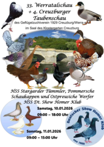 Die Meldezahlen für unsere Hauptsonderschau in Creuzburg stehen fest. Gemeldet wurden 37 Pommersche Schaukappen 85 Stargarder Tümmler 28 Ostpreußische Werfer ...